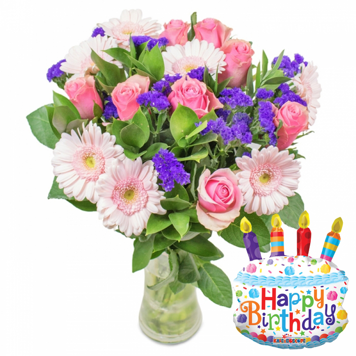 Celebrate their special day with our delightful and unique birthday flower arrangement. This gorgeous bouquet features pink roses, pink germinis, and statice, elegantly paired with fresh ruscus for a charming display.